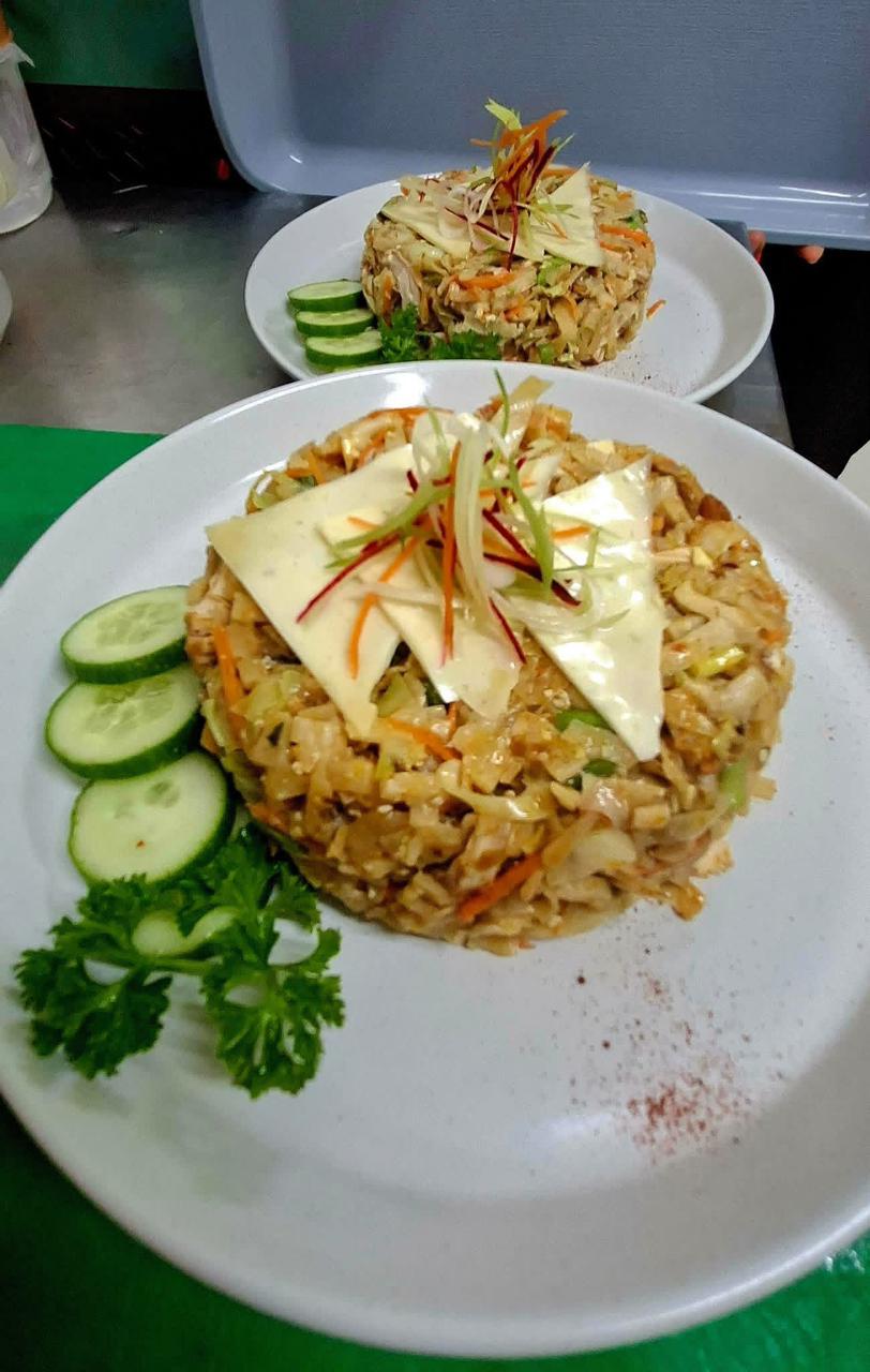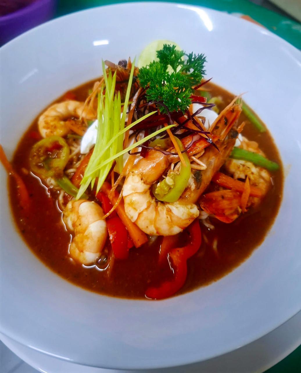 TIGER PRAWNS, EGG, EGG NOODLES, BEANS, CARROTS, WITH COCONUT BASE LAKSA SAUCE. (MILD SPICY)