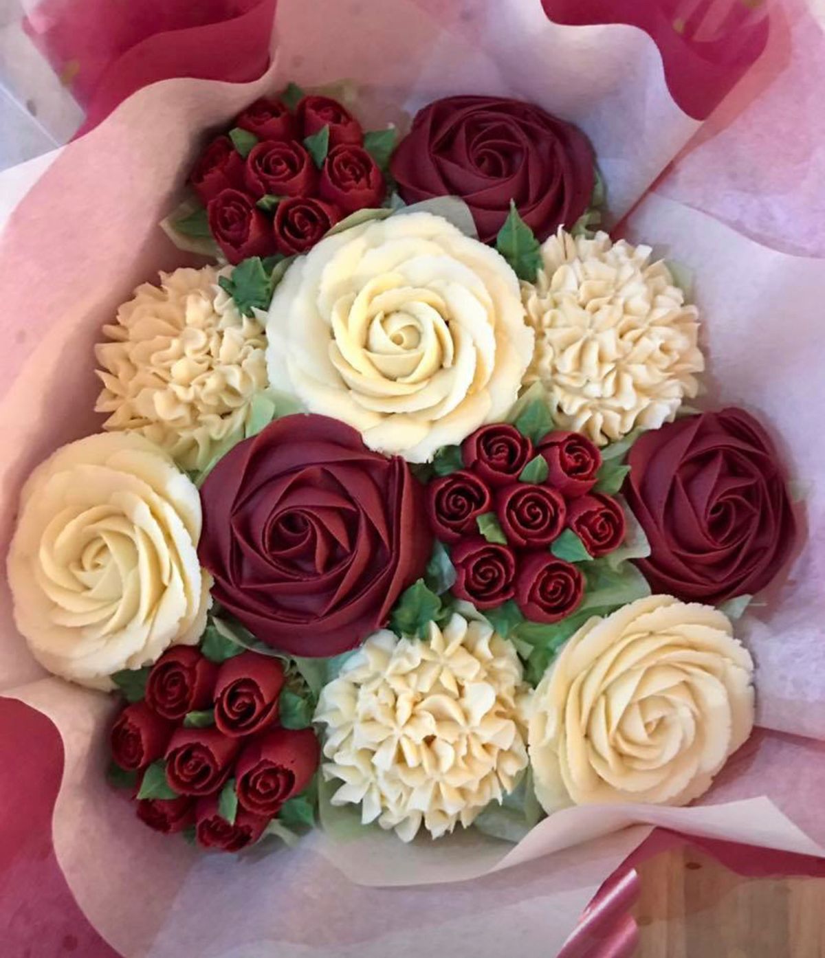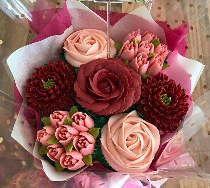 12 floral cupcakes with elegant paper wrapping