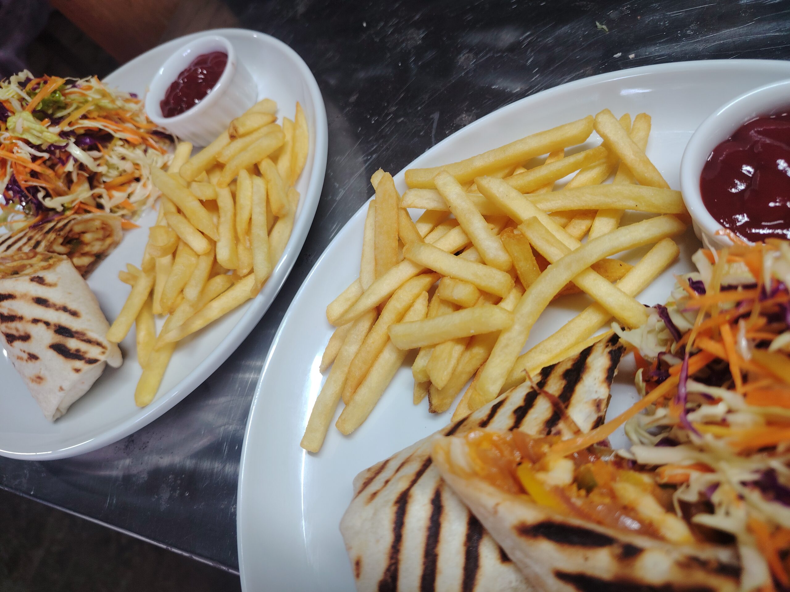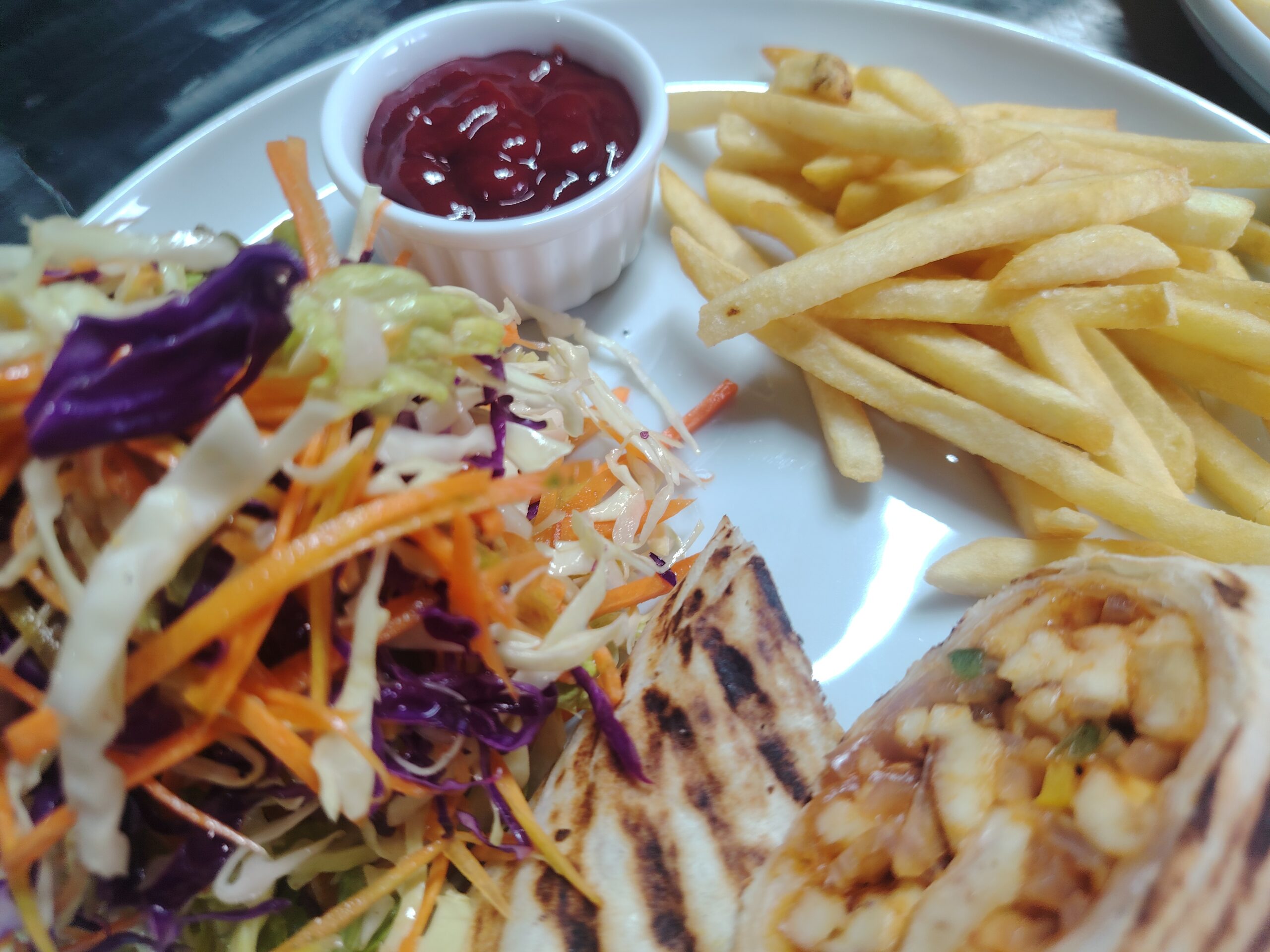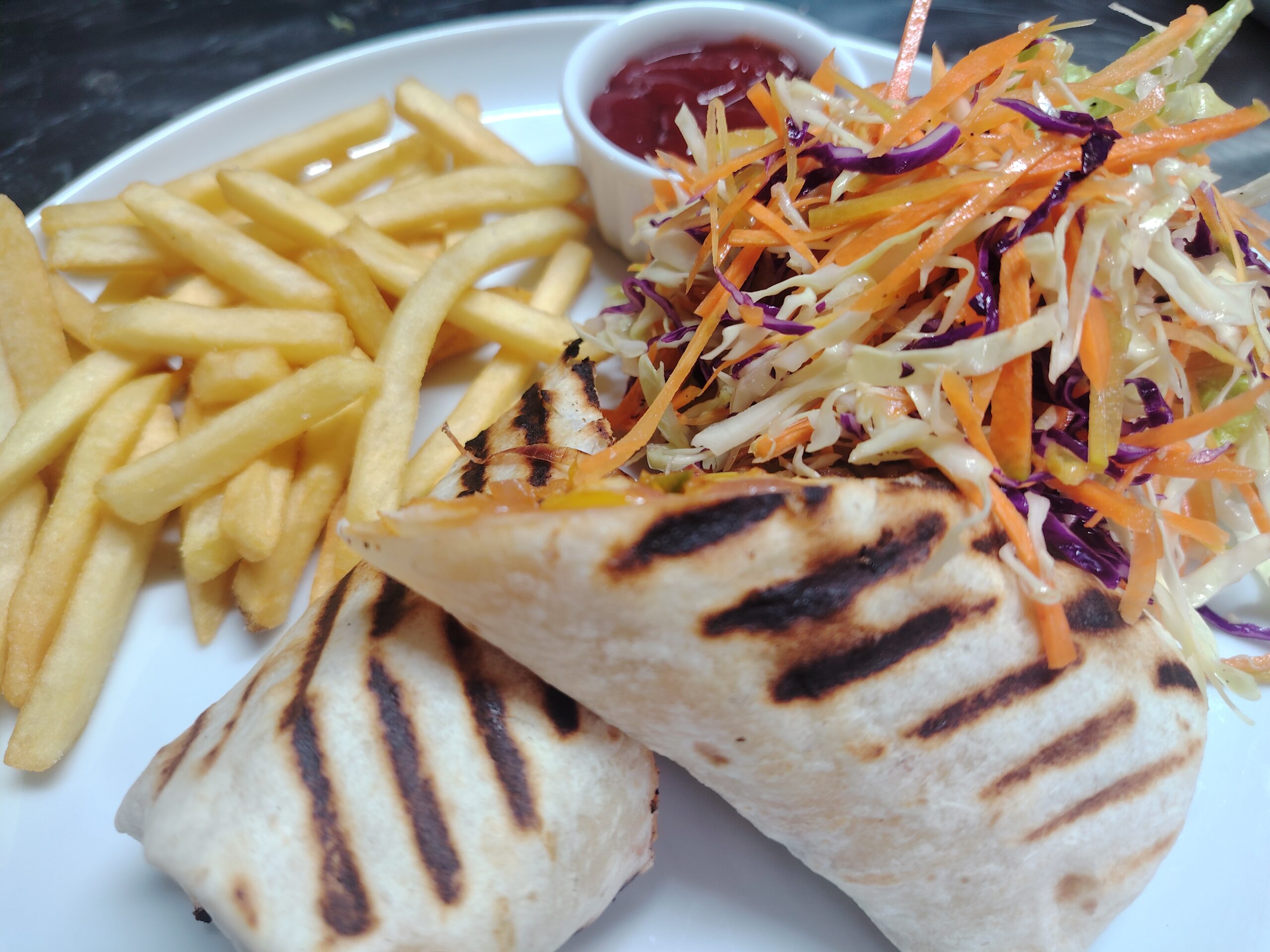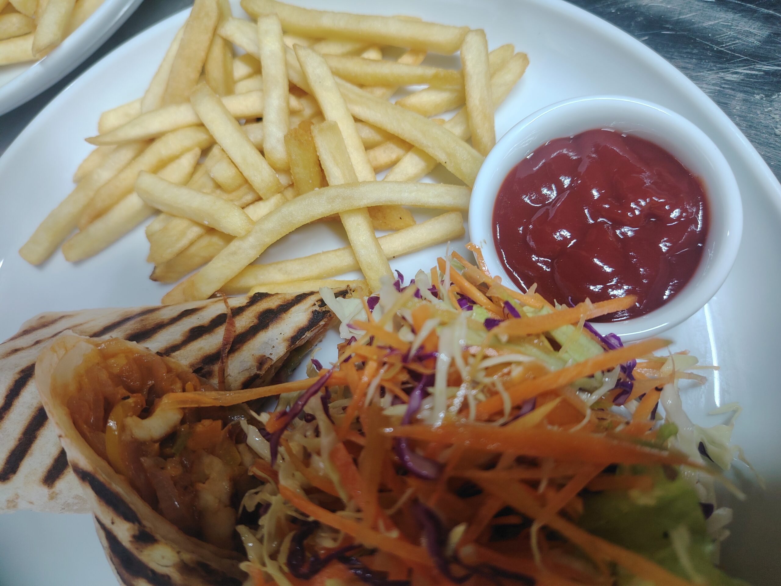 (Grilled chicken wrapped in a soft tortilla with fresh vegetables, served with French fries.)