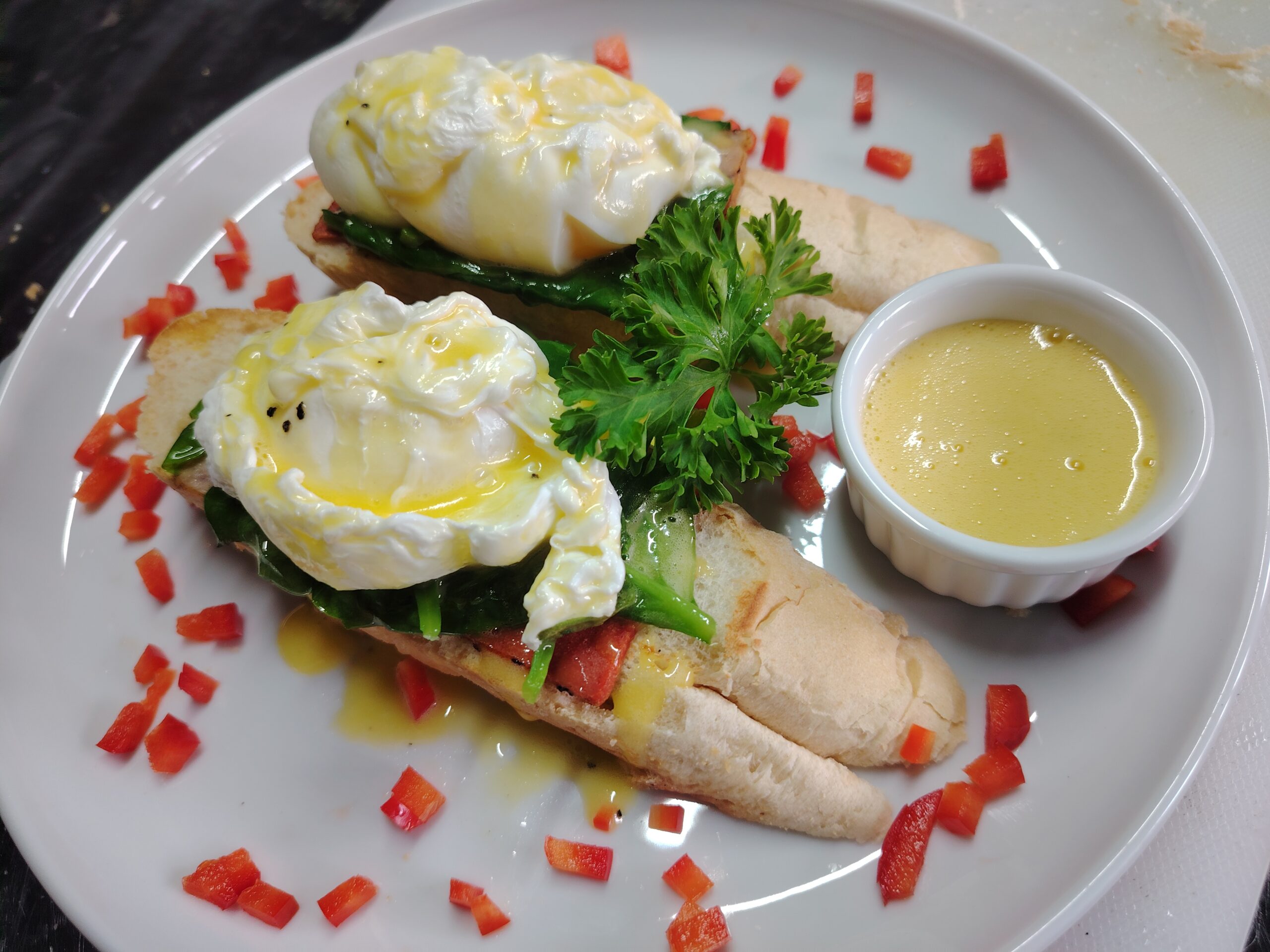 (Poached eggs. English muffin bacon with Hollandaise sauce)