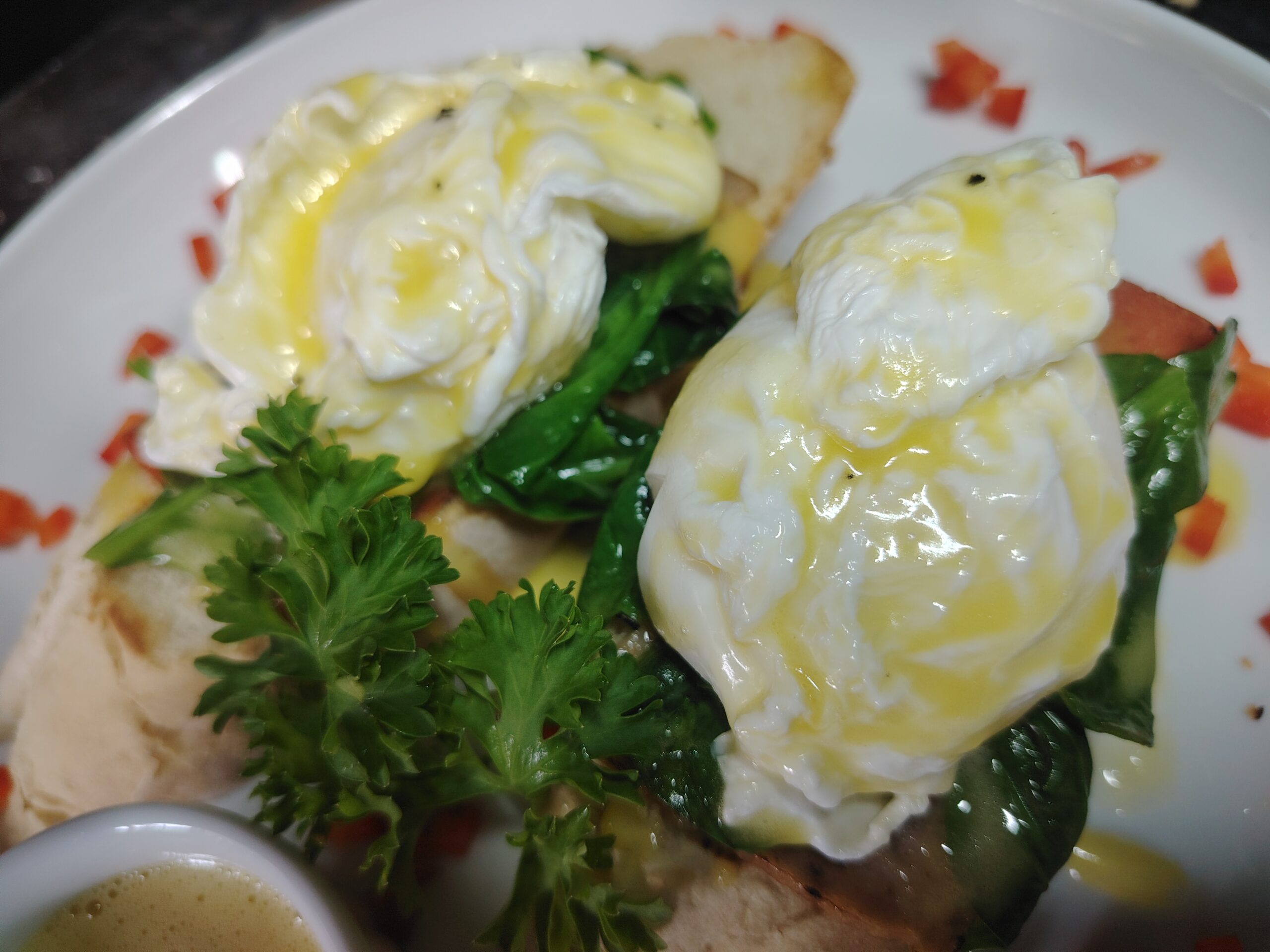 (Poached eggs, English muffin, bacon with hollandaise sauce)