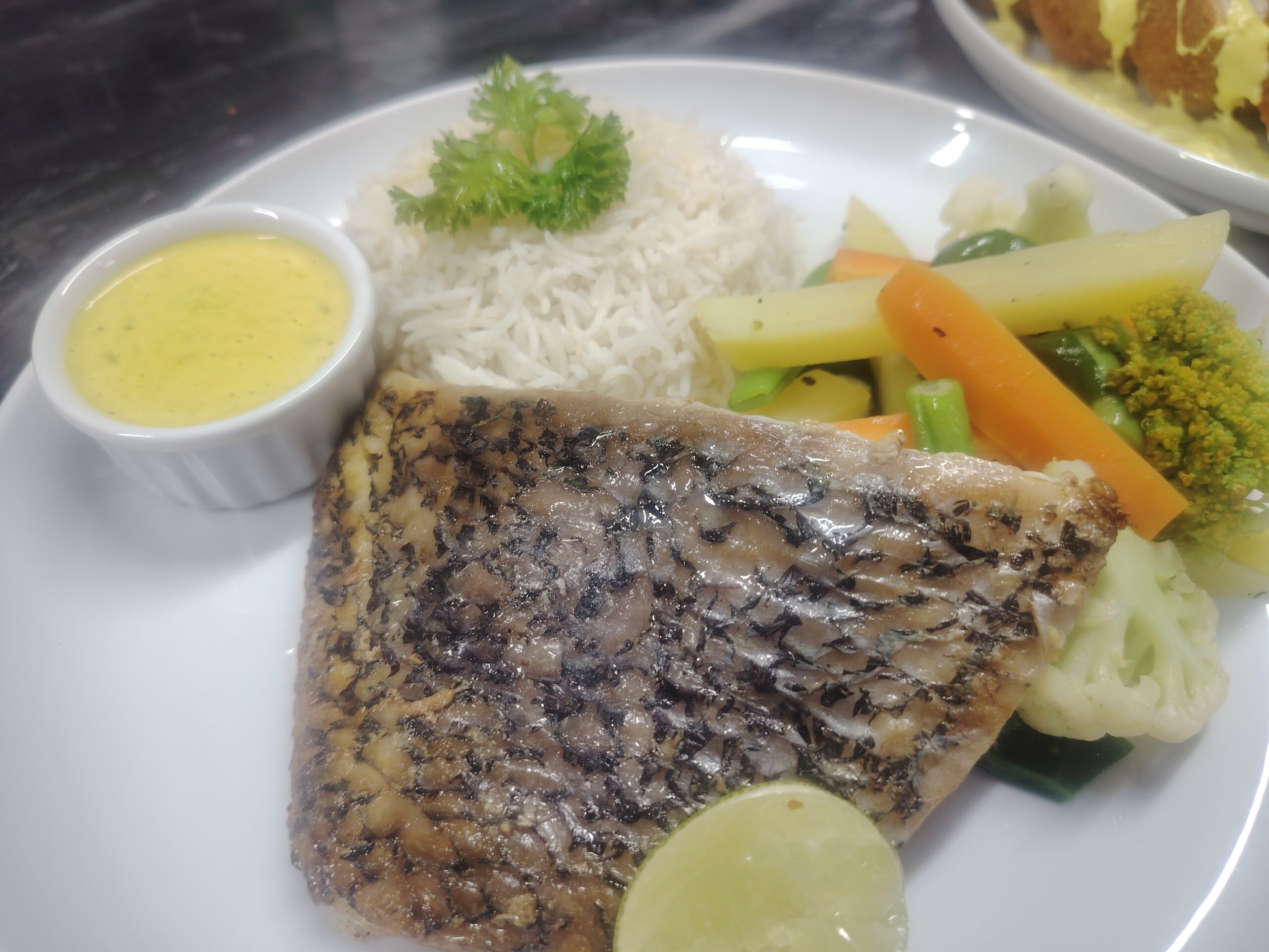 (Pan fried Modha fillet served with sauteed vegetables and couscous finished with a spicy curry coconut sauce for a flavorful meal)