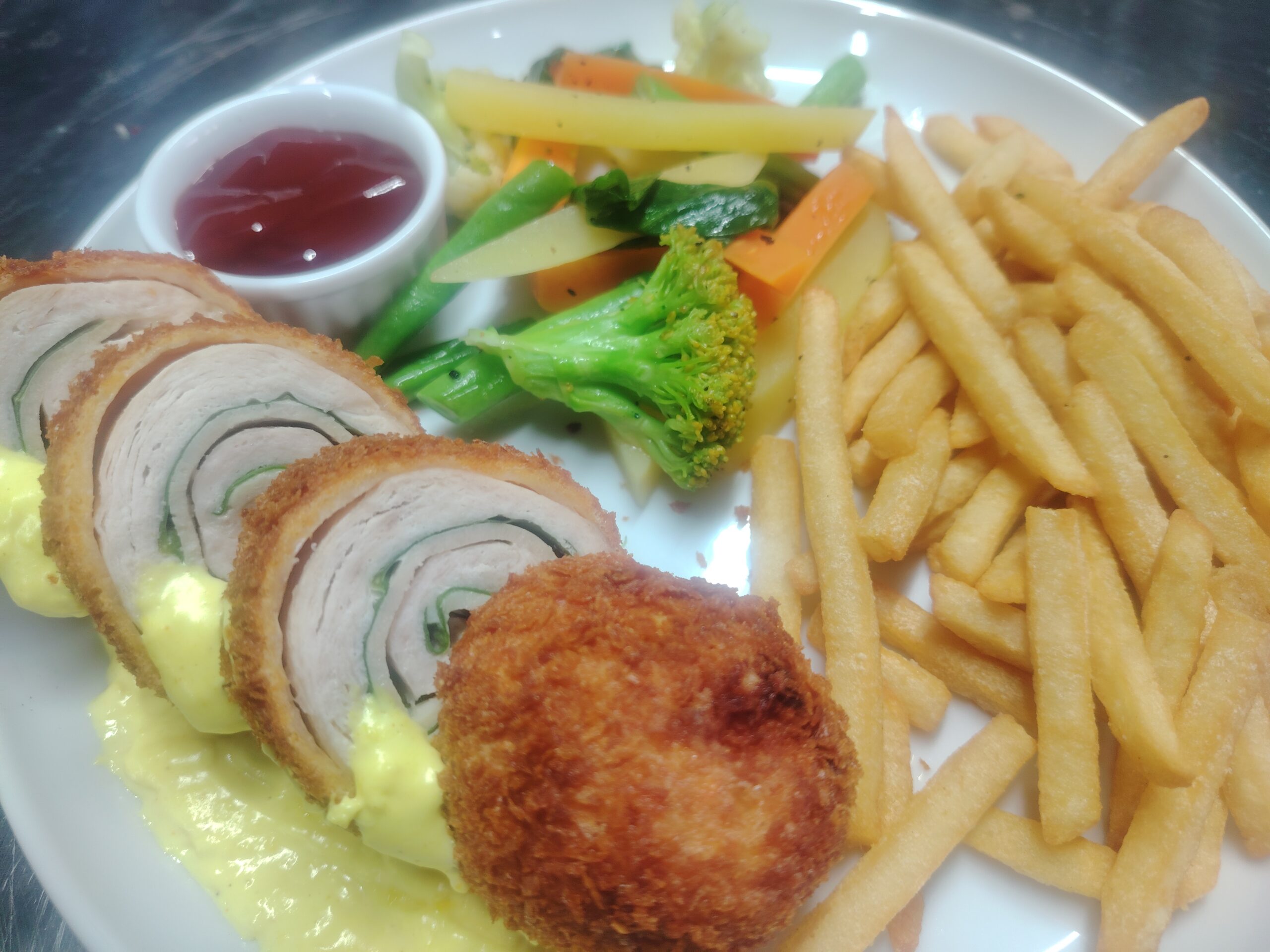 (Chicken breast stuffed with ham and cheese, crumted with pai and Fried to a crispy golden perfection and served with, boiled vegetables and mashed potatoes.)